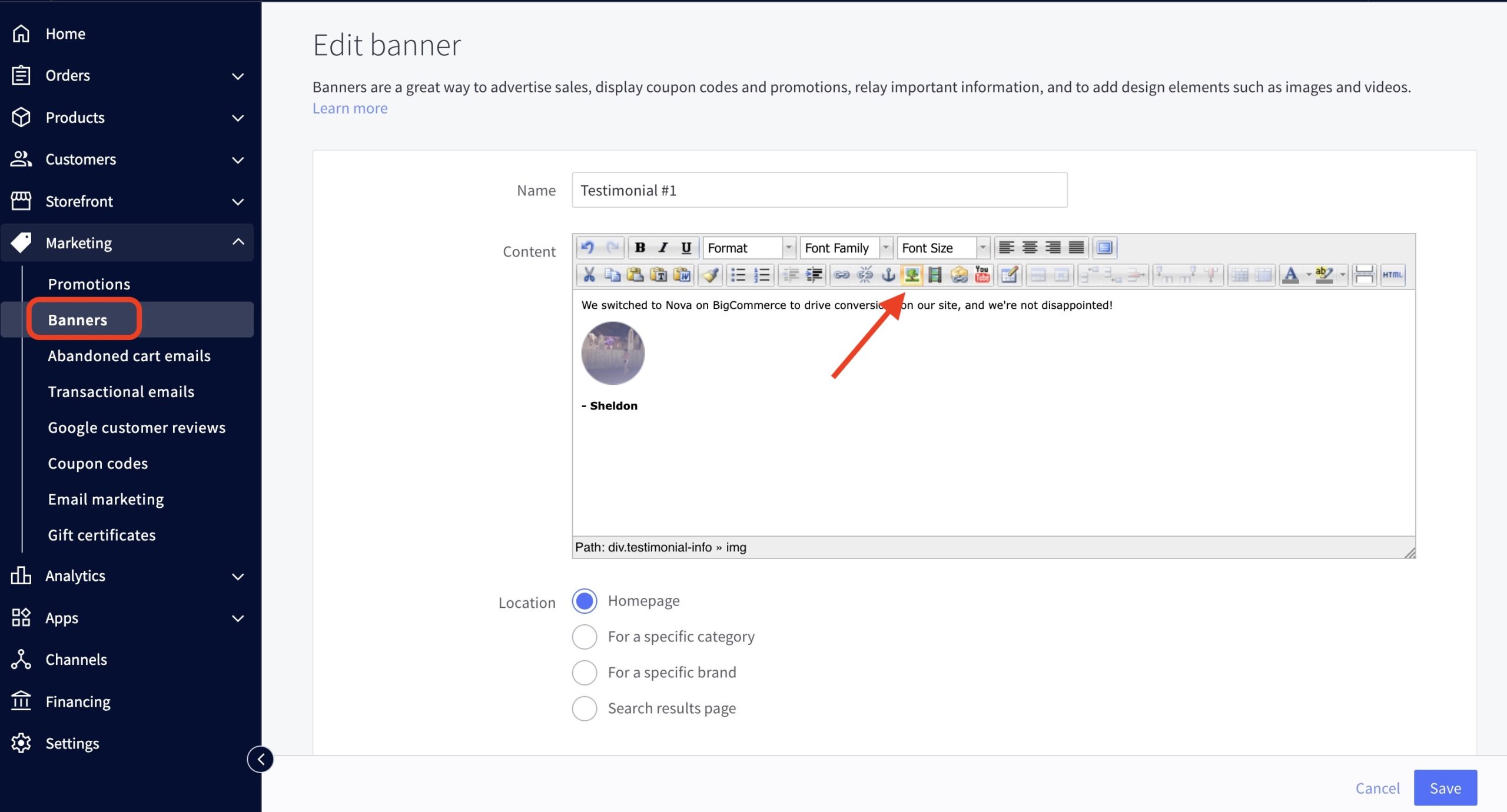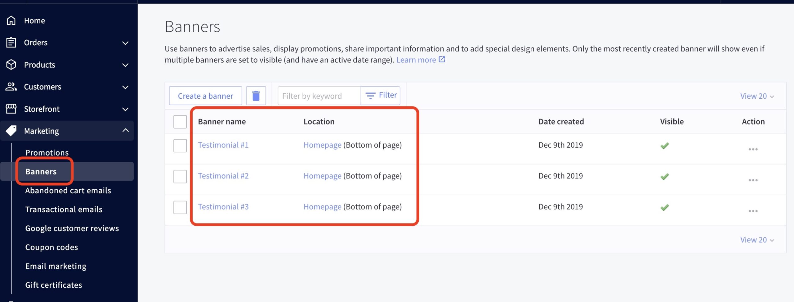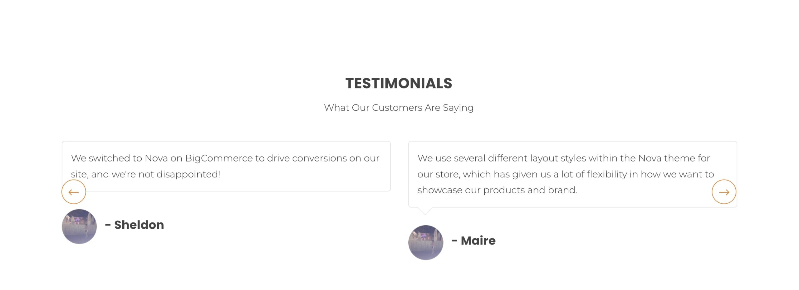 • Testimonials are loaded in the BigCommerce dashboard under the Marketing > Banners.