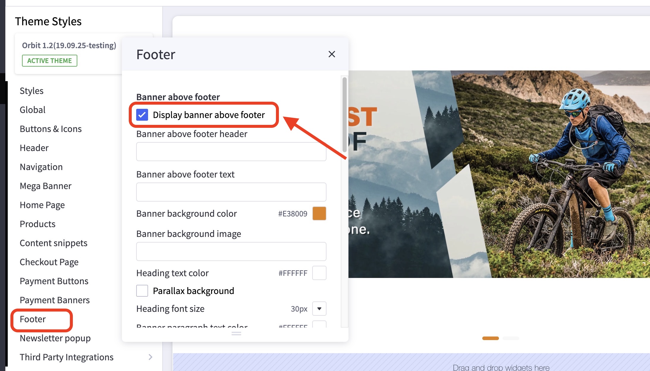 • In the first Banner above footer subsection toggle the checkbox labelled Display banner above footer.
