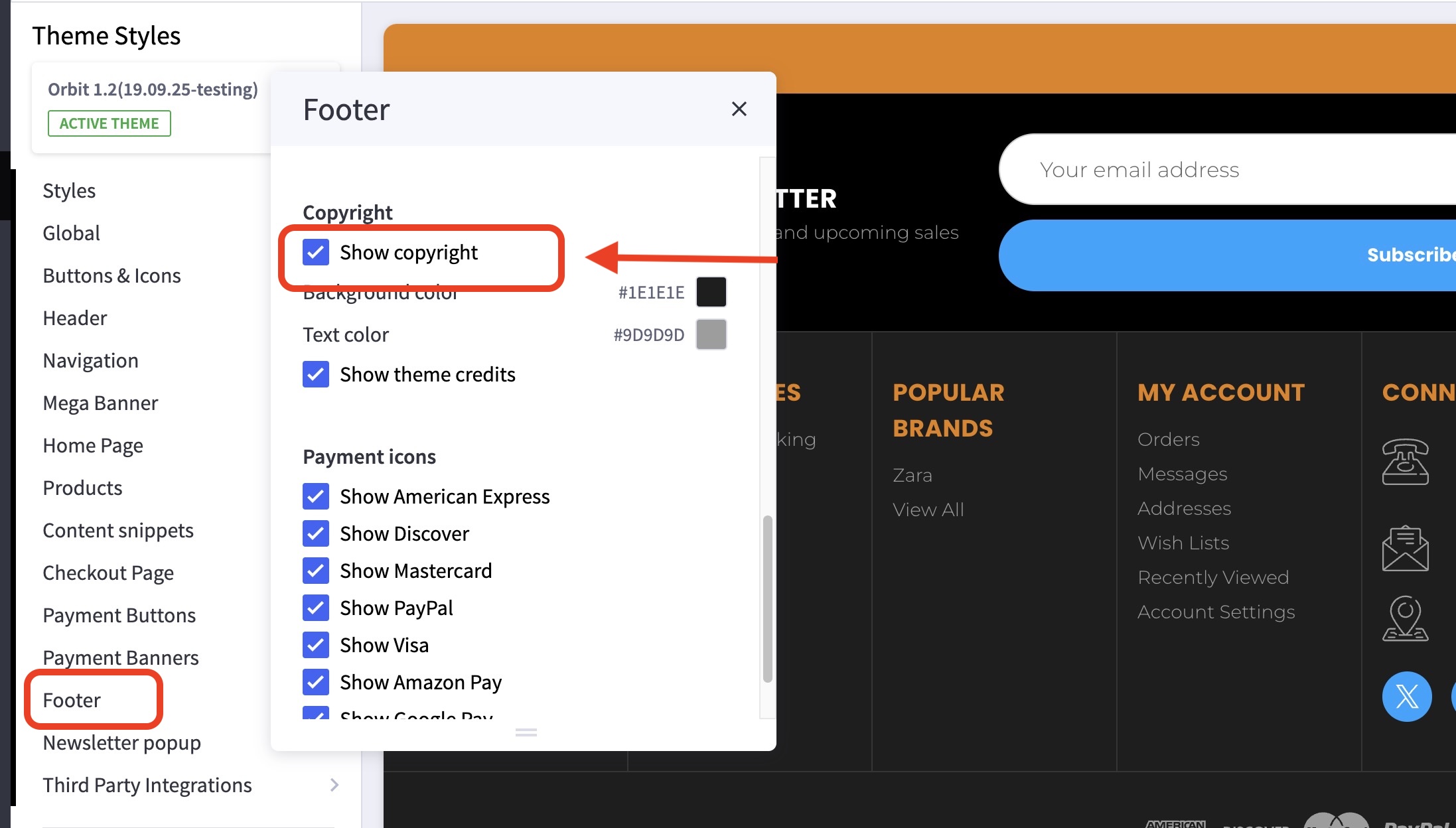 - In the theme customizer, go to the Footer section and scroll down to the Payment Icons subsection.