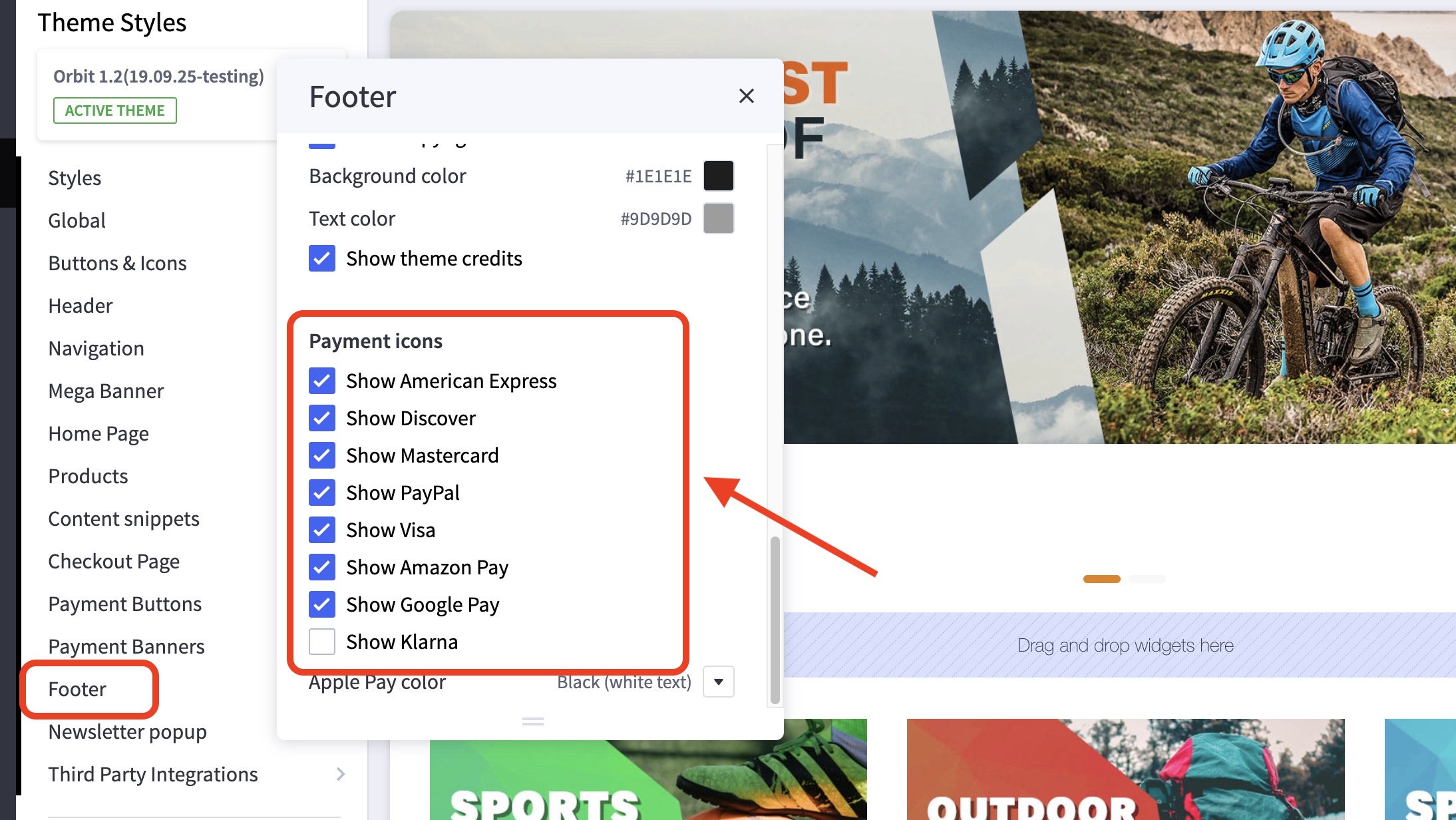- Toggle the checkboxes to enable the payment icons you’d like to display.