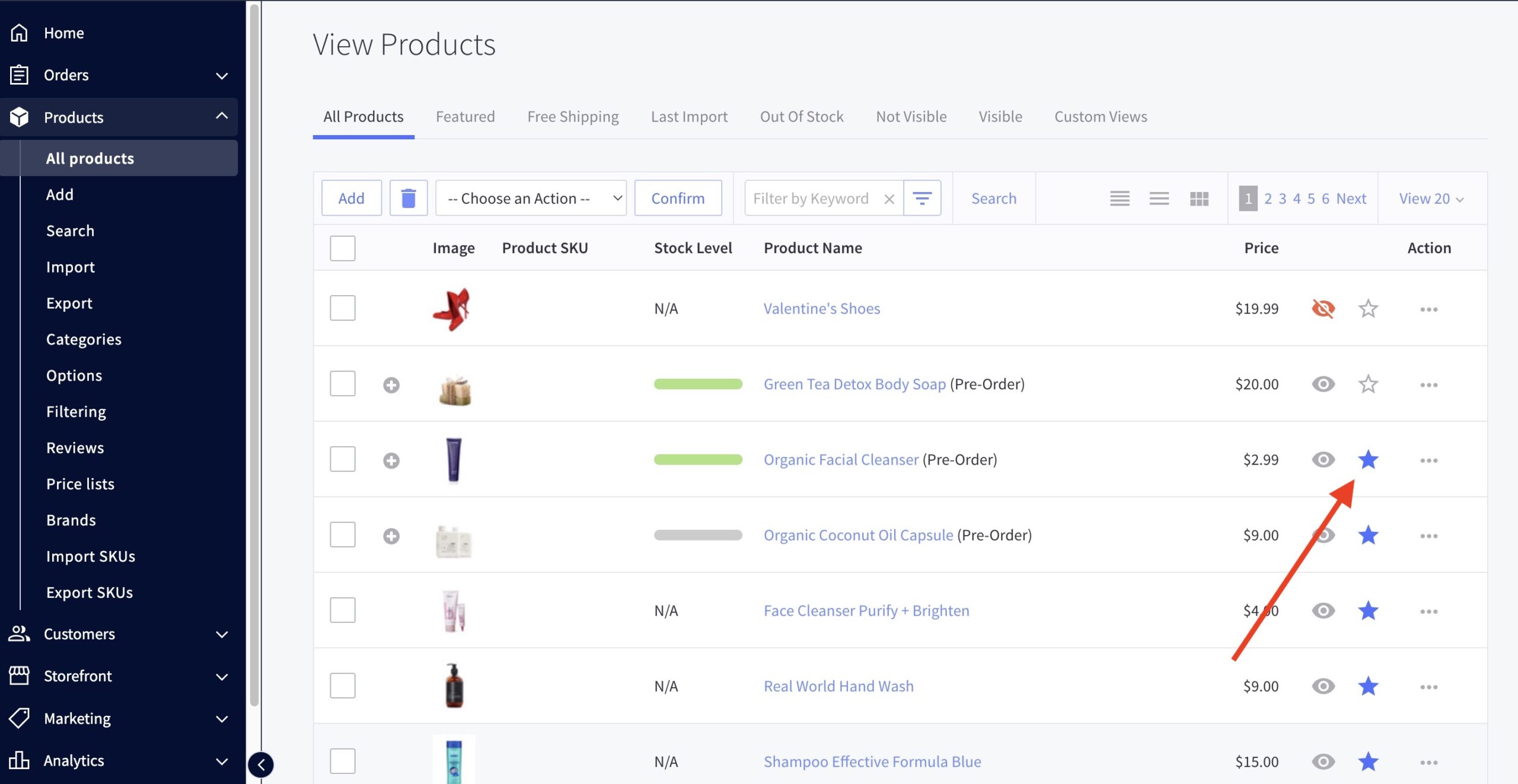 - Click the star next to the product name to toggle the featured status.