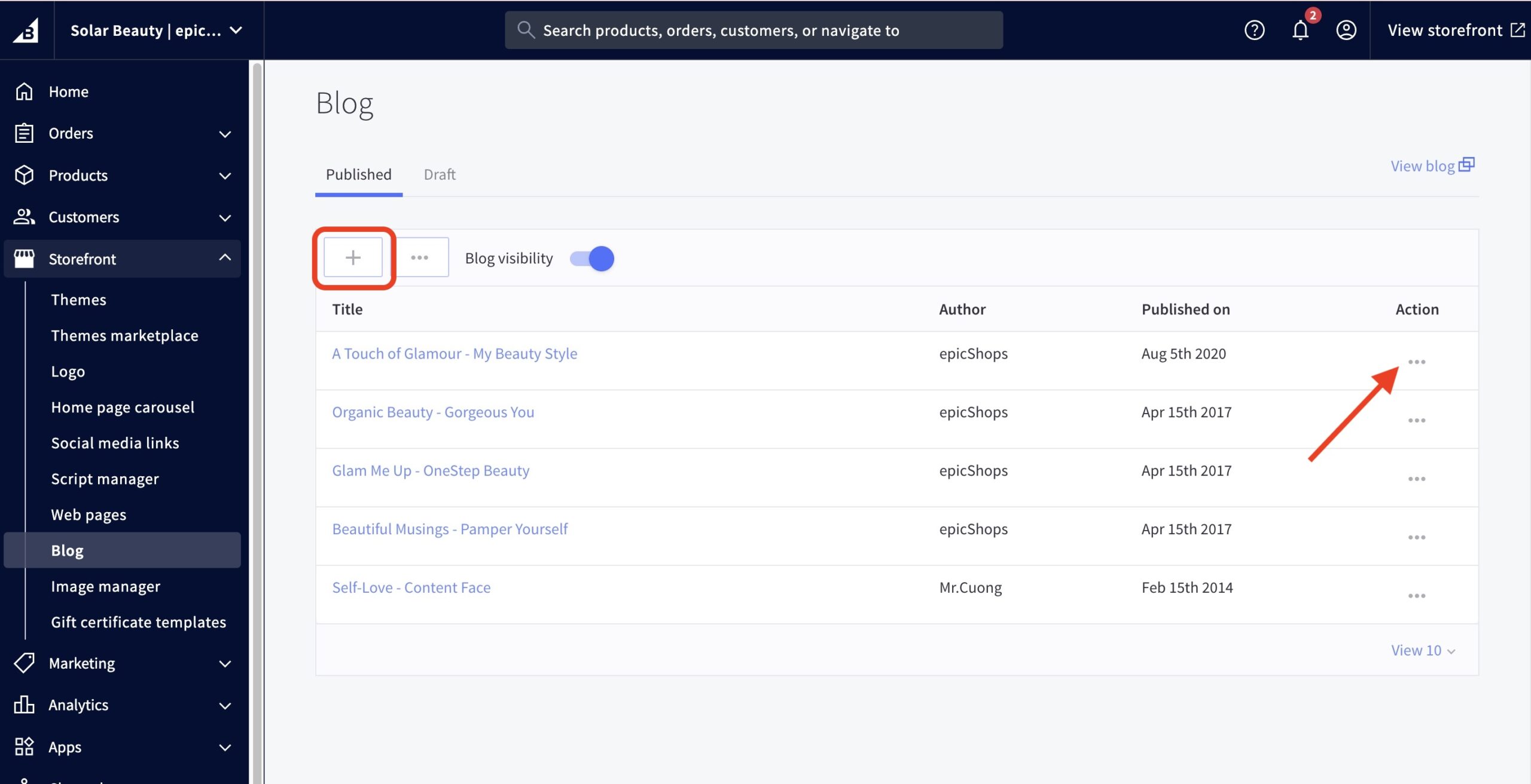 - In the BigCommerce dashboard, go to Storefront > Blog.