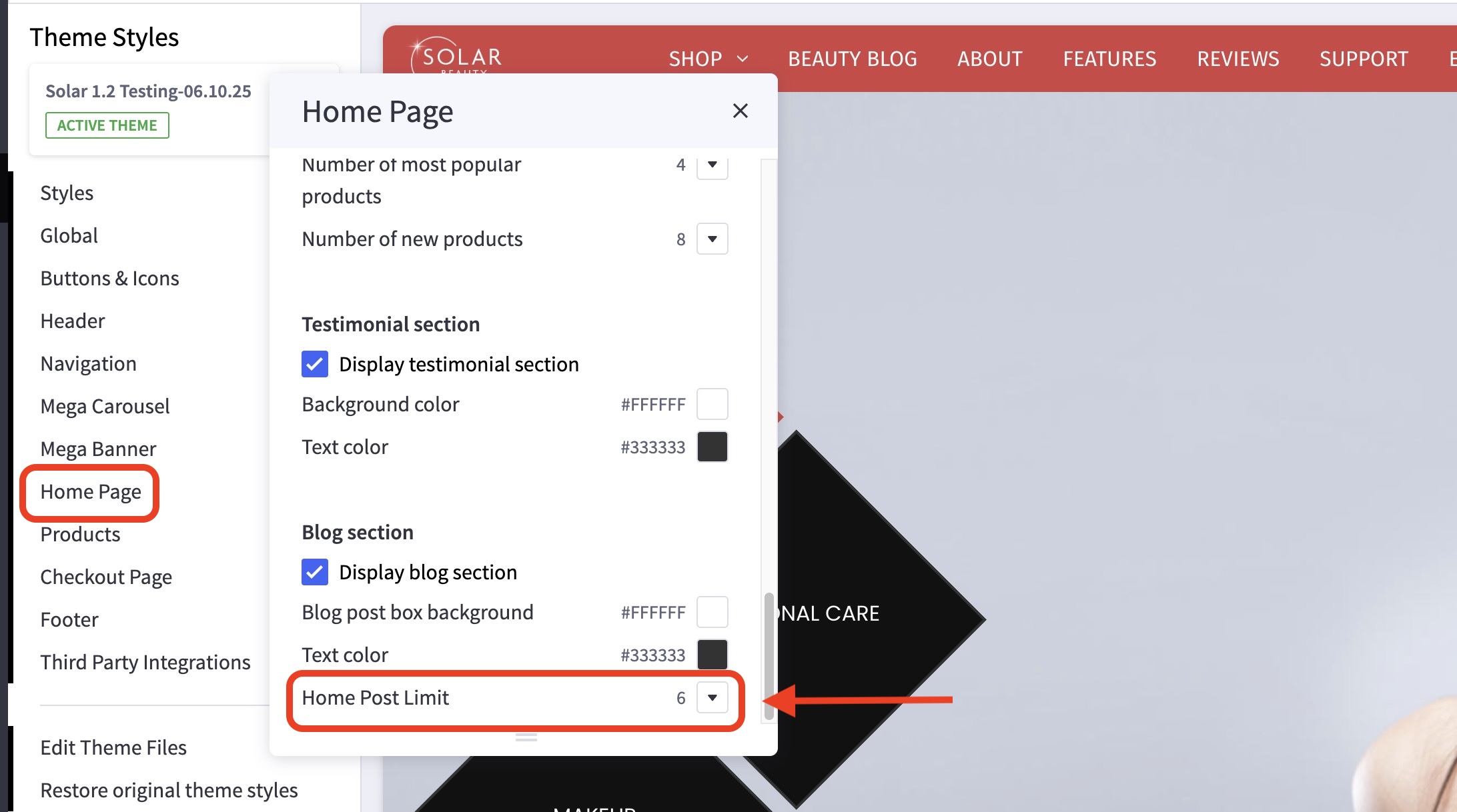 - In the theme customizer, go to the Home Page section and scroll down to the Blog subsection.