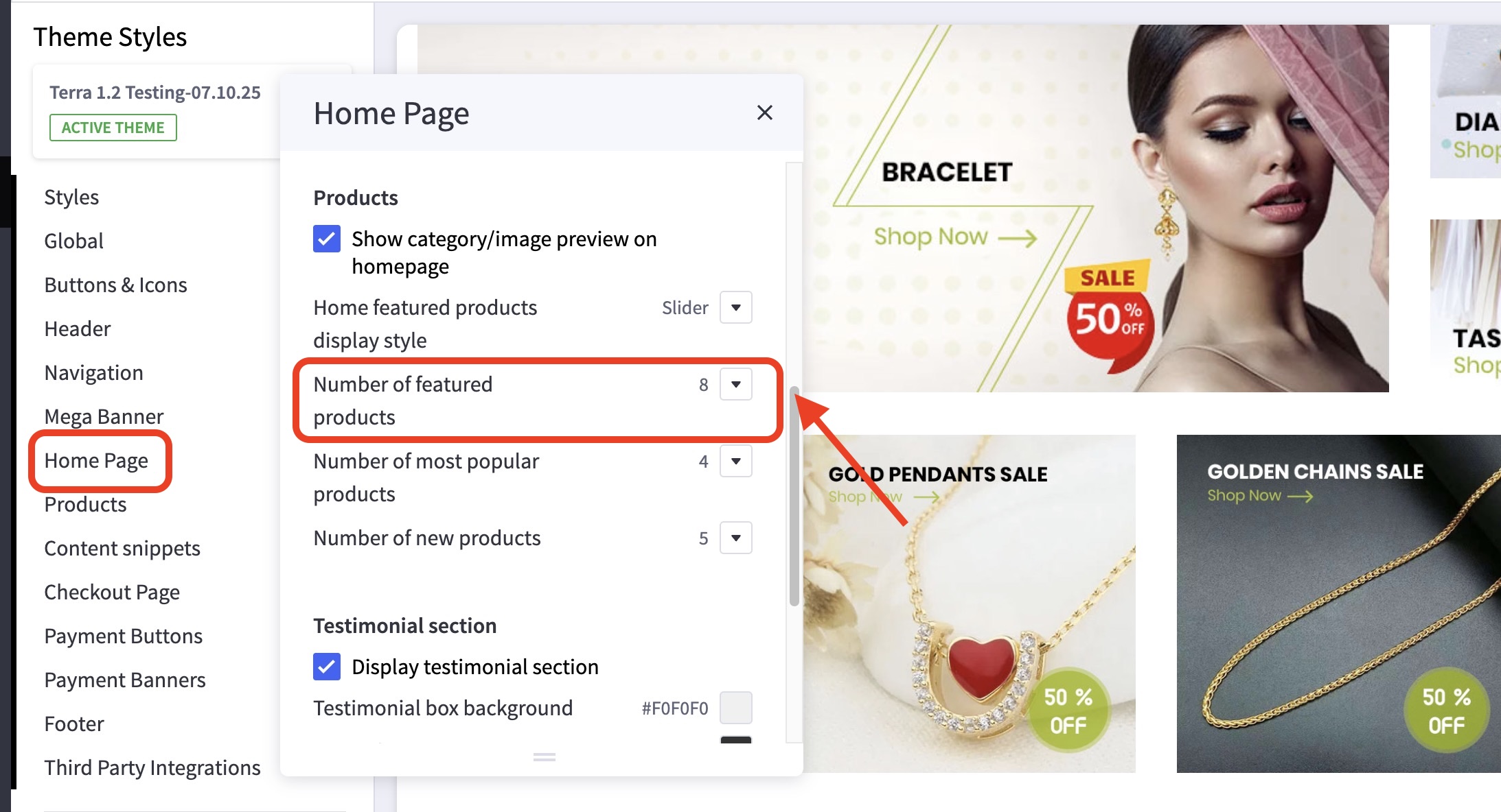 - From the Home featured products display style option, select slider from the dropdown menu.