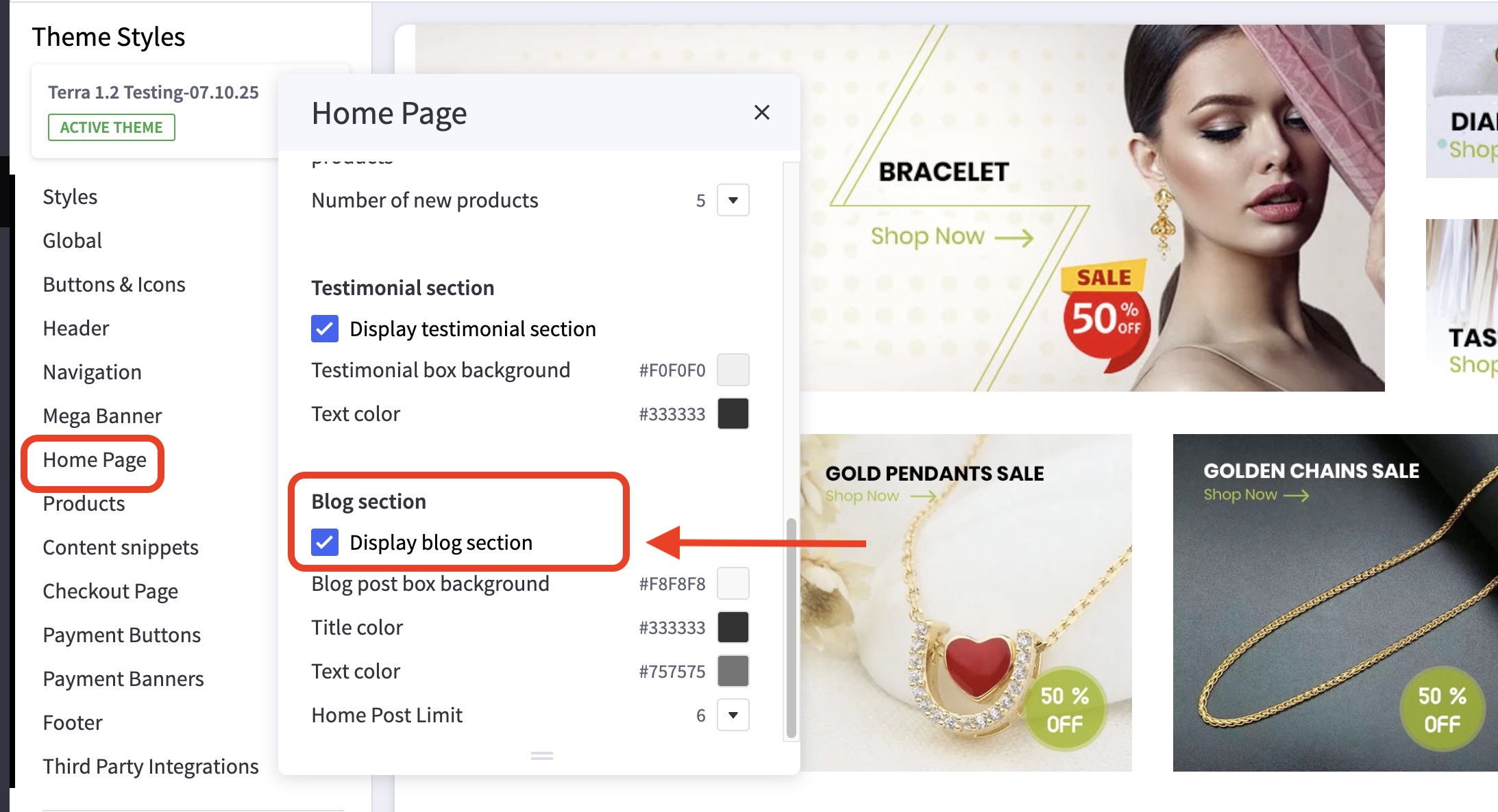 - Uncheck the box Display blog section.