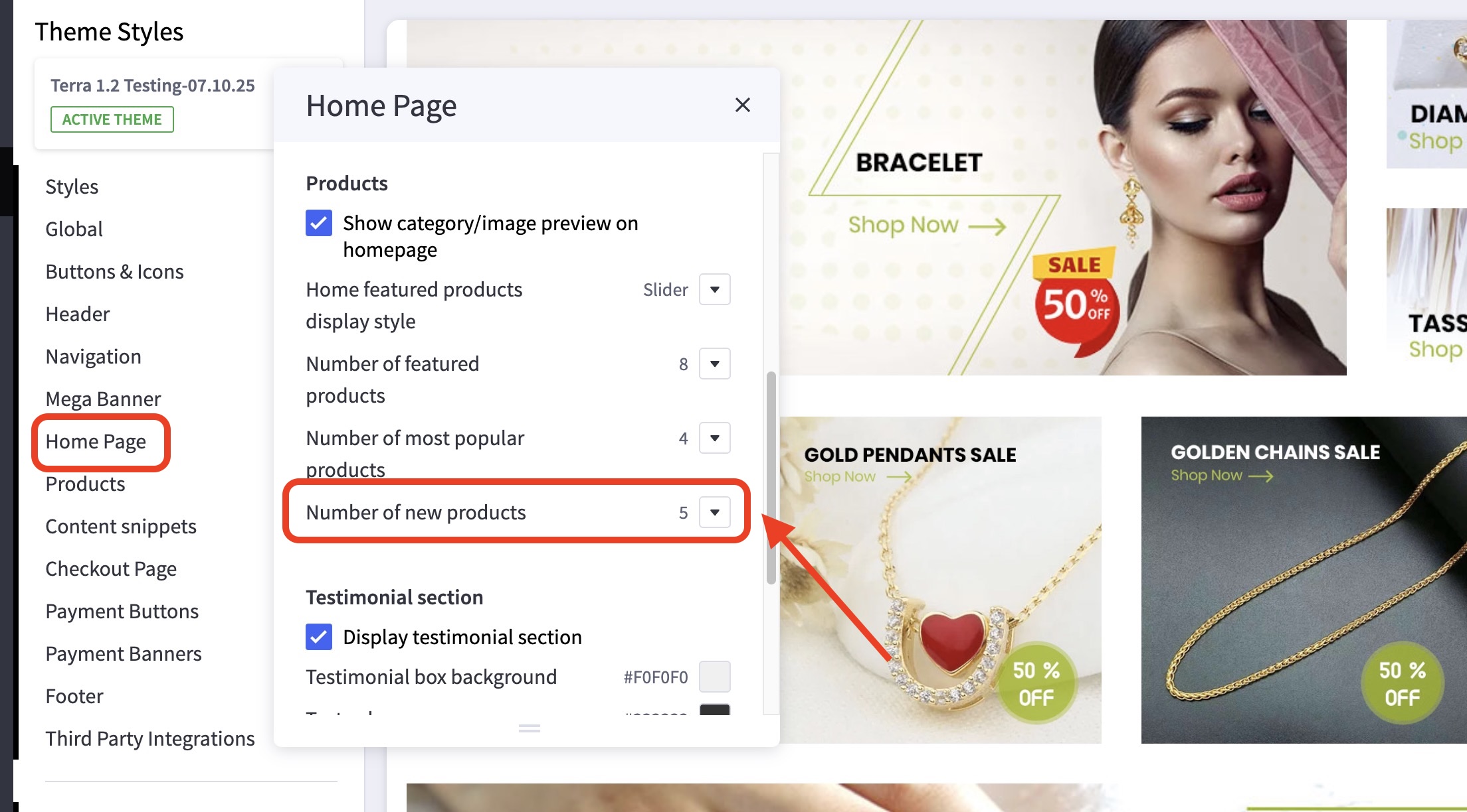 • In the theme customizer, go to the Home Page section and scroll down to the Products subsection.