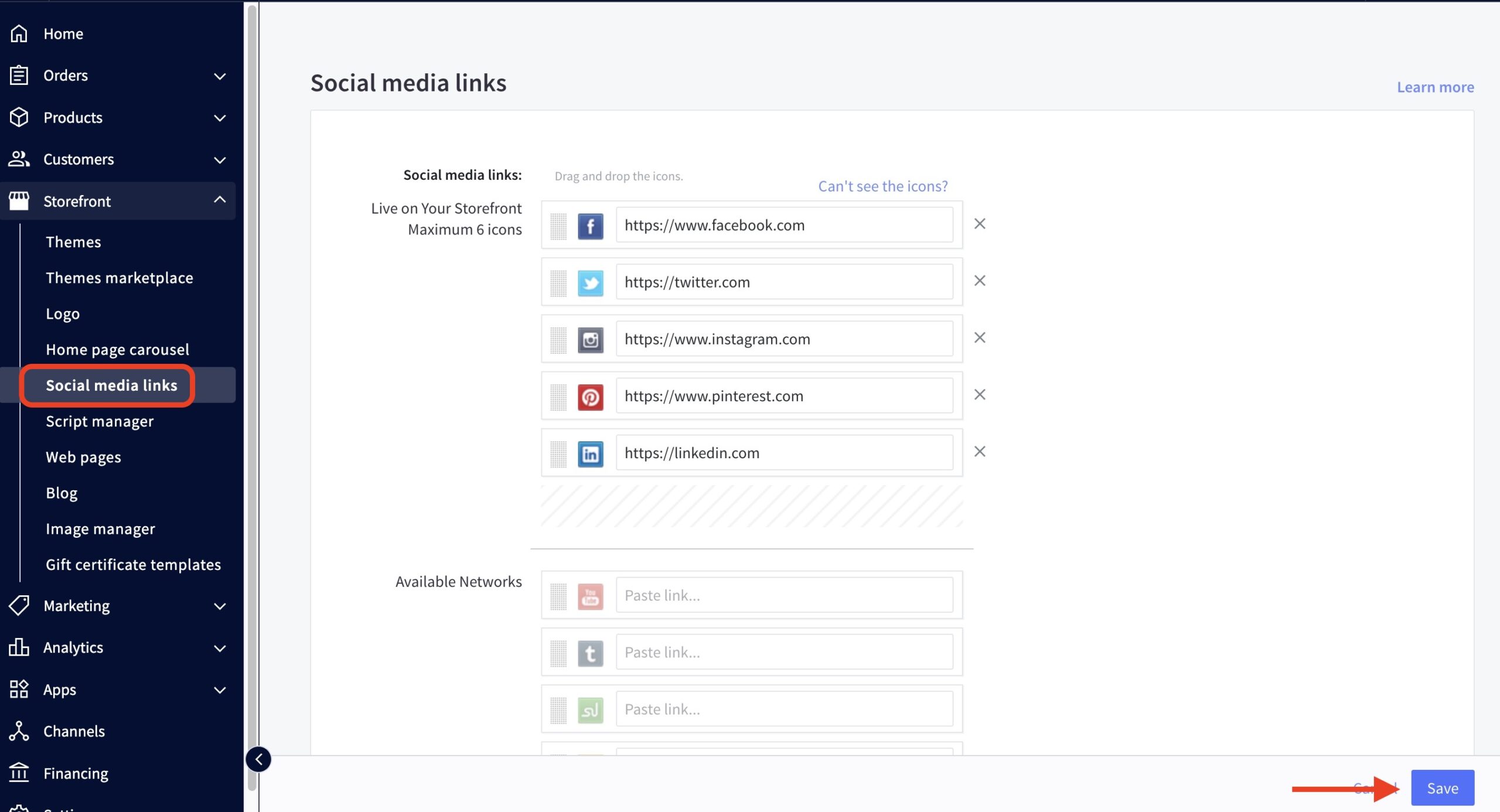 - In the BigCommerce backend, go to Storefront > Social Media Links