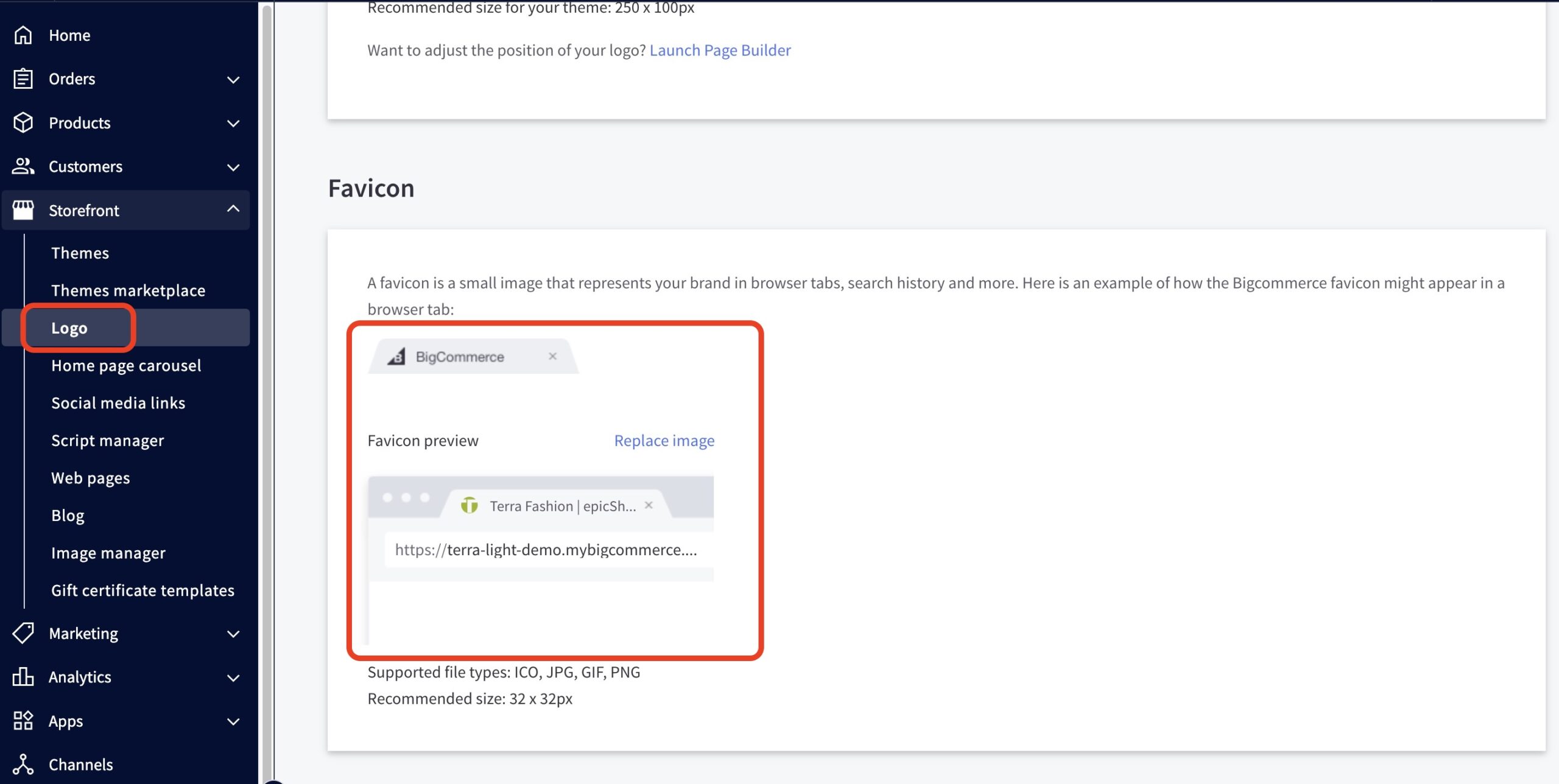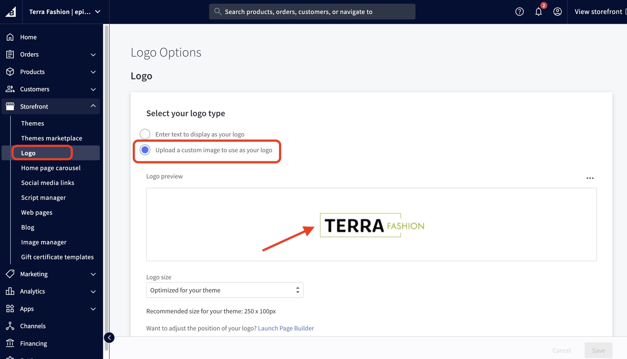 - From the BigCommerce dashboard, go to Storefront > Logo